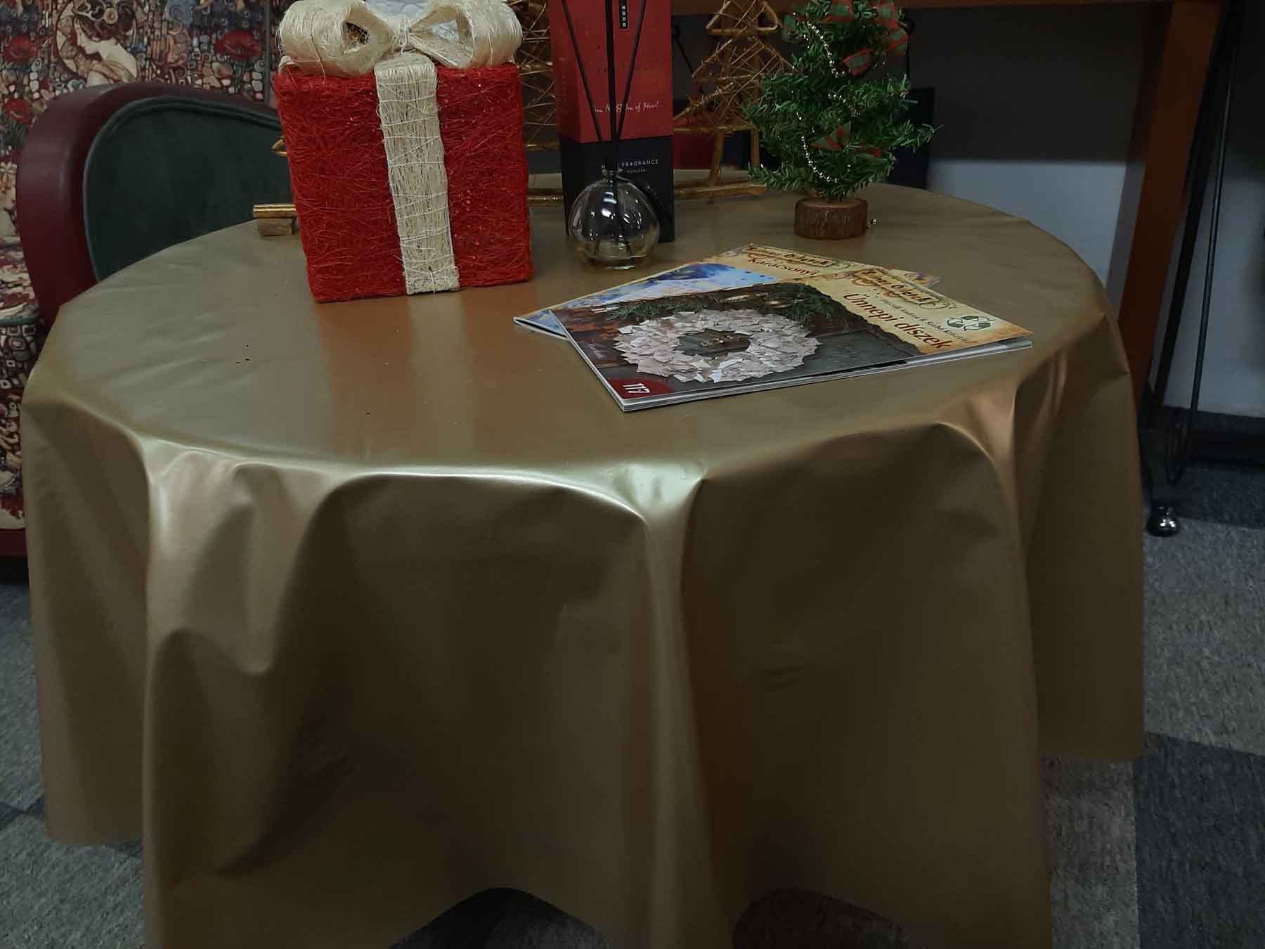 Egyszínű arany vagy ezüst vízlepergető terítő anyag, amiből az étkezőasztalra lehet ünnepi hangulatot varázsolni, vagy egy középen mikulásvirággal díszített terítő anyag, melyenek a széle díszes XMAS felirattal kiírt. Előkelő megjelenést kölcsönöz az asztal körüli térben.